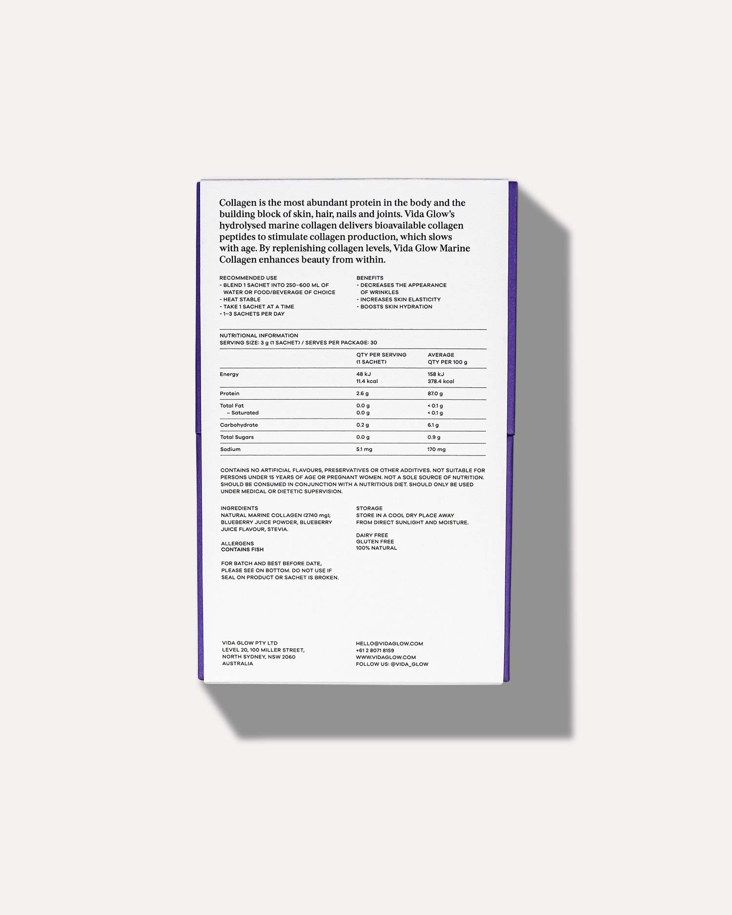Blueberry Natural Marine Collagen is a collagen peptide supplement made from sustainably-sourced fish skin. It’s been activated to boost absorption (so your body can actually use it) and stimulate fresh collagen production.