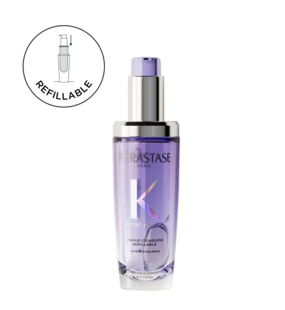 - Apply 1–2 drops of Kerastase Blonde Absolu Refillable Hair Oil to wet or dry hair.