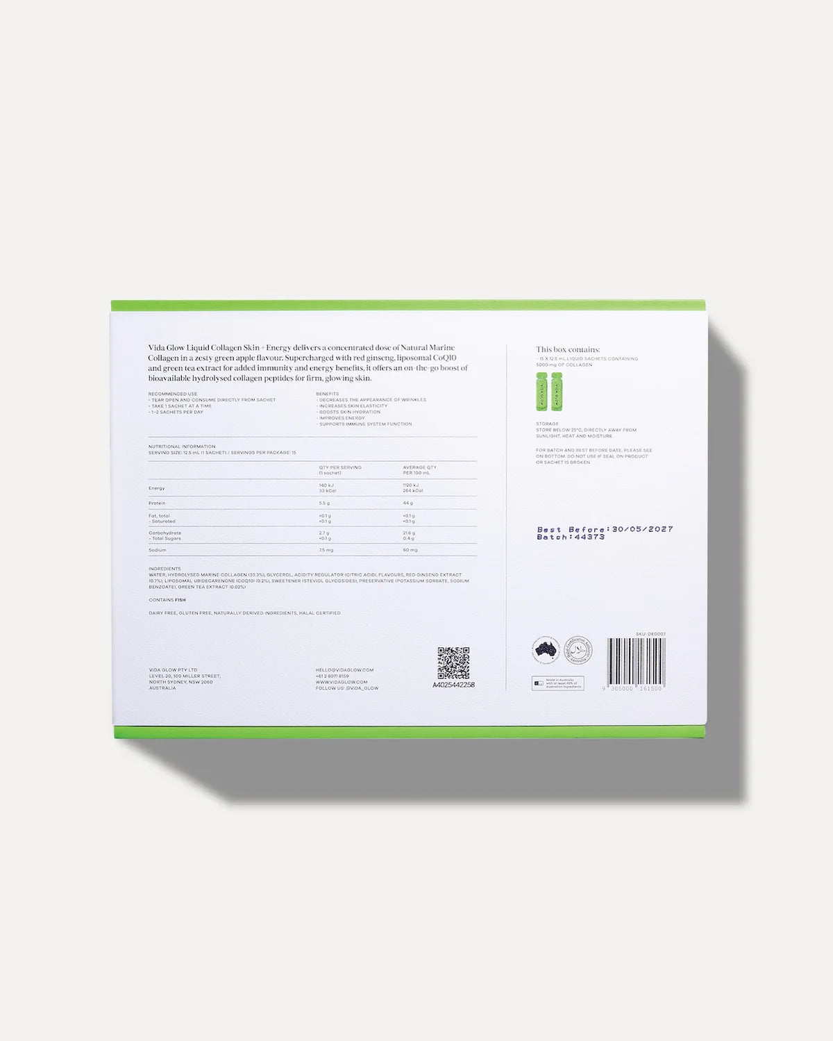 With a crisp green apple flavour, Liquid Collagen Skin + Energy kickstarts collagen production while delivering full-body benefits in one delicious step. Simply tear, sip and go.